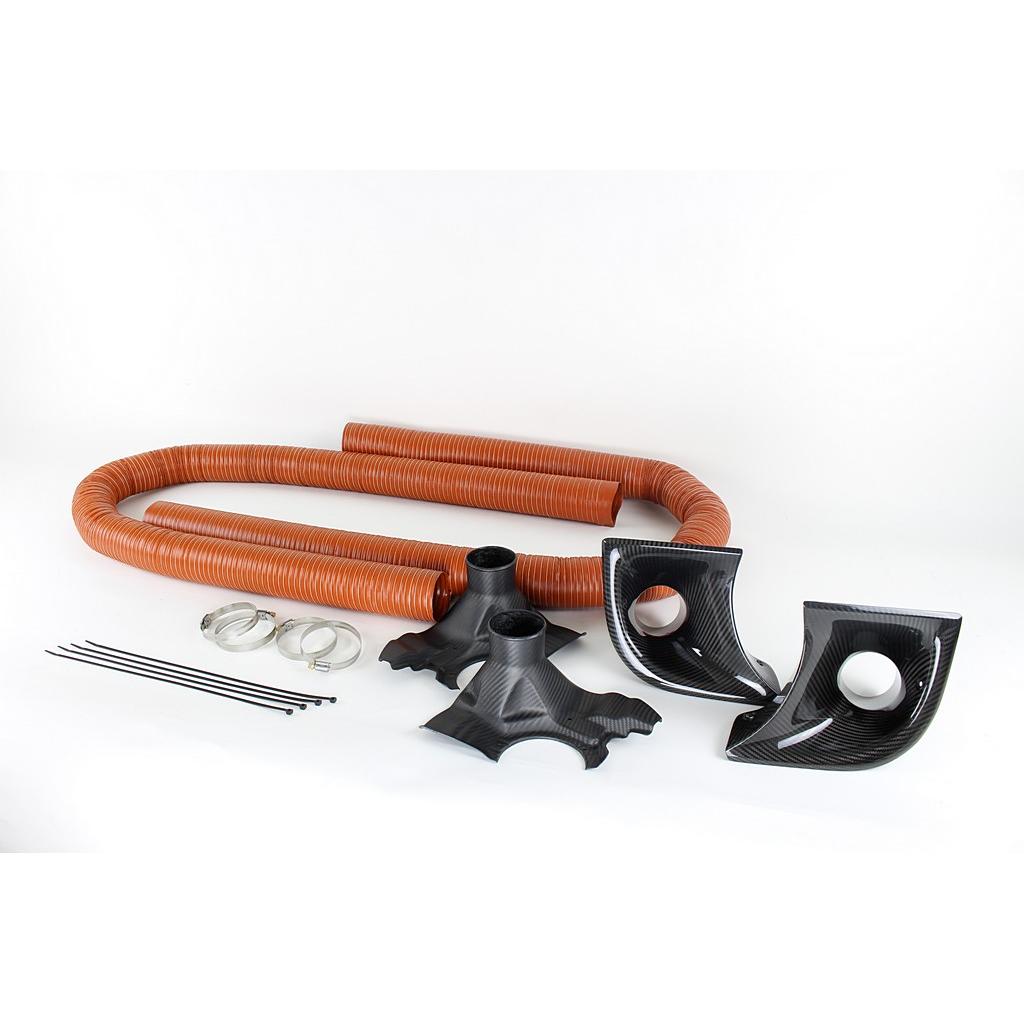 The APR Brake Cooling Ducts are aerodynamically-optimized to "funnel in" massive amounts of air. Also known as the venturi effect, when the vehicle speed increases, this funneled-in air increases in both pressure and velocity as it passes from the larger frontal area into the smaller pipe section of the brake duct. When matched with appropriate high-temperature air duct hoses , the APR Brake Cooling Ducts will help to channel in large volumes of fresh air to help cool down red-hot brake rotors lap after lap on the track.